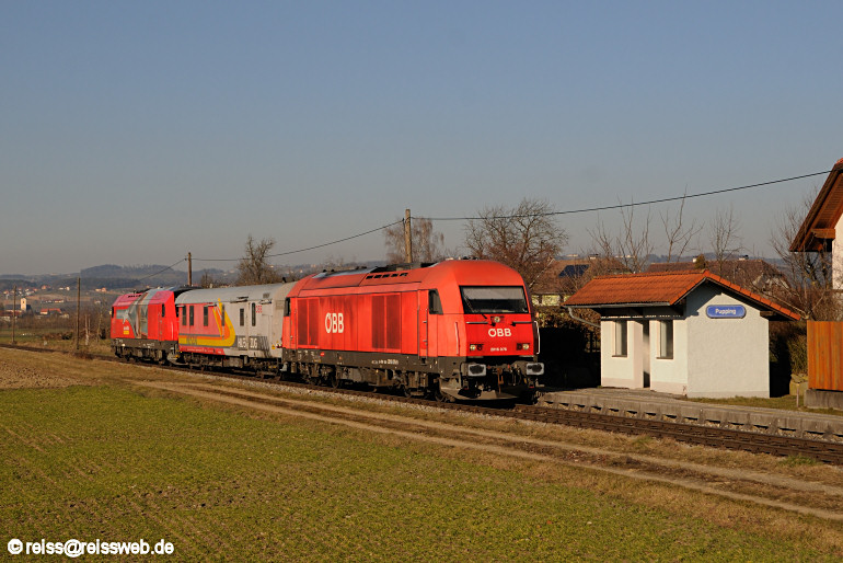 2016 076 der ÖBB bringt die in Aschach a.d.Donau entgleiste 2016 911 von St&H nach Eferding und wird dann mit dem Hilfszugwagen nach Linz zurückkehren (Pupping, 25.02.2014).