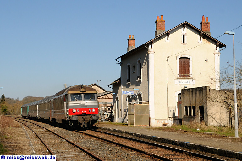 BB 67348 durcheilt mit dem Intercité 3909 (Paris) - Bourges - Montluçon die Station Urçay (20.03.2014).