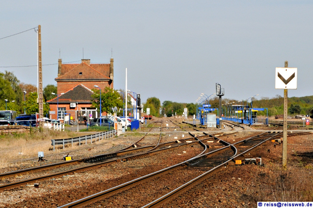 | Das Bild zeigt die Ein-/Ausfahrt Obermodern im Zuge der Strecke Strasbourg - Mommenheim - Sarreguemines. Die beiden abzweigenden Gleise 1 & 2 führten einst nach Haguenau, werden aber seit Jahrzehnten nicht mehr planmäßig genutzt. Teile der zweigleisigen Strecke waren zum Zeitpunkt der Aufnahme (17.04.2014) noch vorhanden. |
