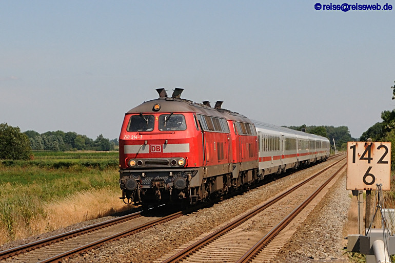 218 314 und 397 führen den IC 2193 Westerland (Sylt) - Göttingen zwischen Friedrichstadt und Lunden südwärts (23.07.2014).