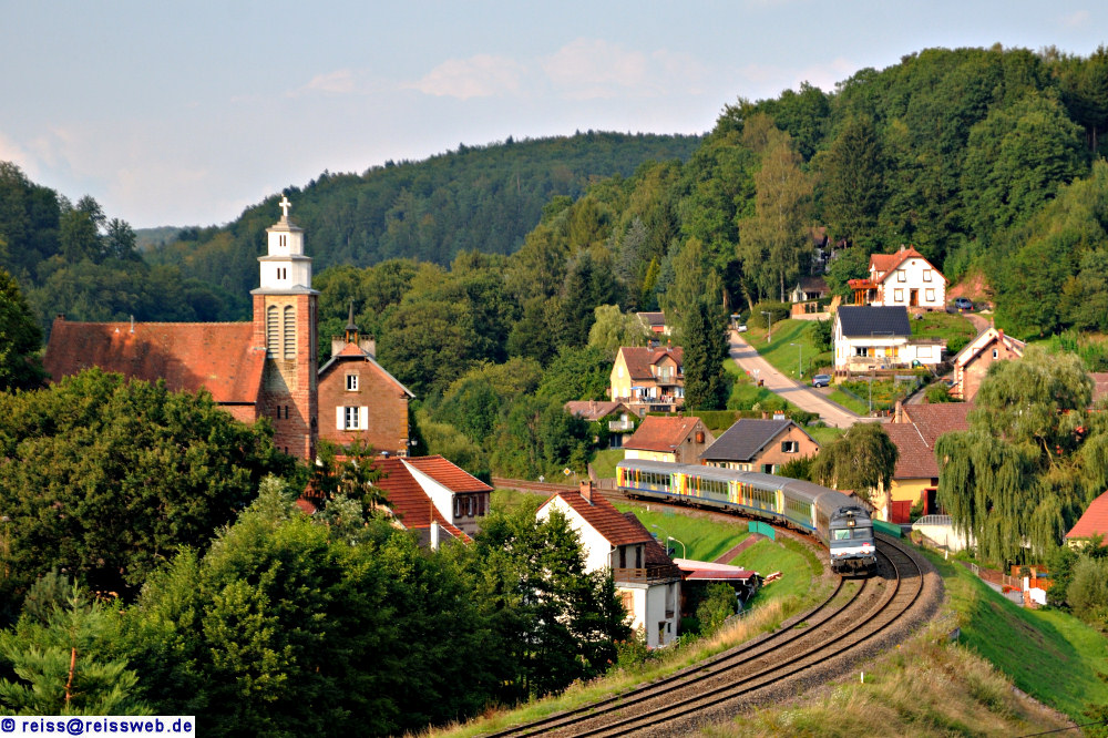 Eine unerkannt gebliebene BB 67400 vom Depot Strasbourg fährt am 05.08.2014 mit dem TER 30908 durch die kleine Ortschaft Frohmuhl. Deren Einwohnerzahl hat sich von 241 (Stand 1968) auf 188 (Stand 2011) verringert (Quelle: Wikipedia).