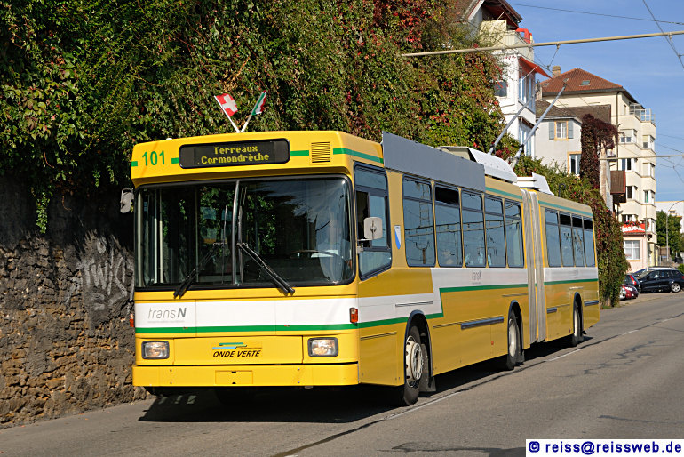 Aus der Serie der 1991 beschafften Gelenkbusse von NAW/Hess/ABB fährt Wagen 101 auf die Haltestelle Gare / Blaise Cendrars in Neuchâtel (Neuenburg) zu (28.09.2014).