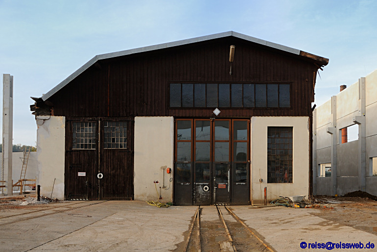 Stand der Arbeiten am Lokalbahnschuppen in Vorchdorf im Herbst 2014 - die äusseren Teile sind bereits abgebrochen (18.10.2014).