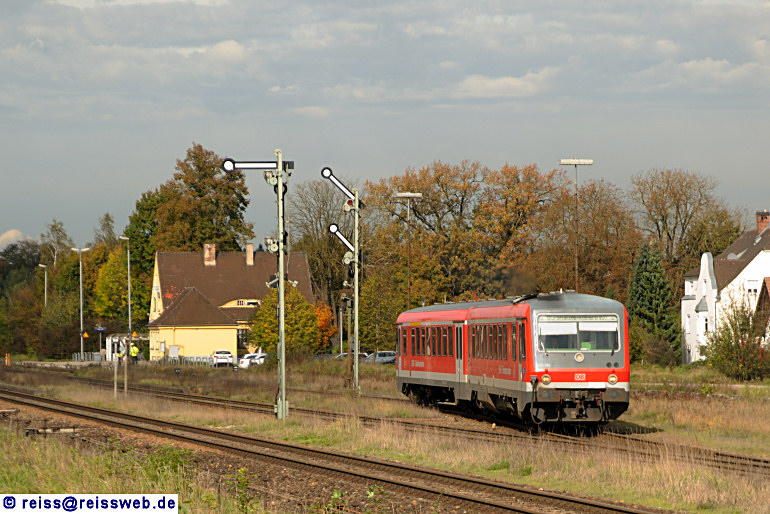 628 584 verlässt als Regionalbahn 27155 Mühldorf - Burghausen den Bahnhof Tüßling (20.10.2014).