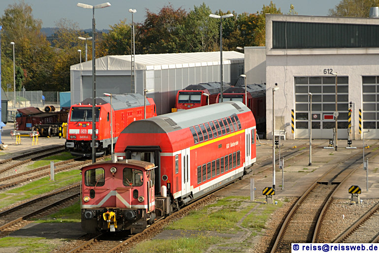 Köf 335 113 - die Werklok des Bw Mühldorf - hat einen Erstklass-Doppelstockwagen vor dem Schuppen abgestellt (20.10.2014).