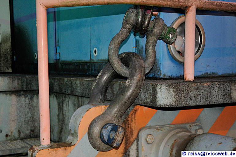 Vom unteren und grösseren der beiden Schäkel wurden vier Stück zur Verladung benötigt. Leider fehlten sie bei der Ausrüstung der Kräne und mussten erst aus Winterthur geholt werden. Damit verzögerte sich die Verladung um ca. 45 Minuten (20.11.2014).