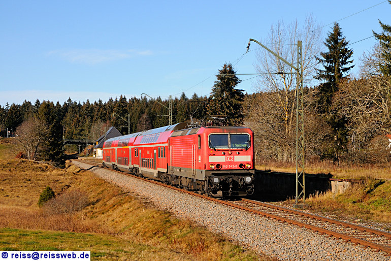 Die Freiburger 143 042 verlässt mit RB 26937 Freiburg - Seebrug den Haltepunkt Altglashütten-Falkau. Der erste Wagen hinter der Lokomotive ist ein ehemaliger DR-Wagen, erkennbar am etwas engeren Dachprofil (Altglashütten-Falkau, 05.12.2014).