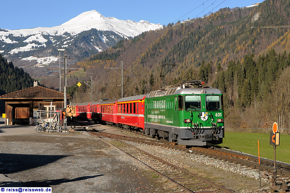 RhB 6e 4/4 II 621 fährt mit RE 1045 Landquart - Davos durch die Station Furna, die aber nur noch dem Gütervekehr (hauptsächlich Holz) dient (15.11.2017).