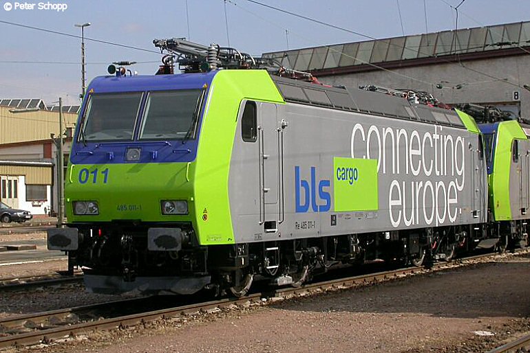 Mit 485 011 - 020 hat die BLS inzwischen eine 2. Serie der Baureihe 485 bestellt. Mit Abnahmedatum "Spiez 08.06.04" steht 485 011 am 18.06.2004 im Bh Haltingen. Die Aufnahme stammt von Peter Schopp.
