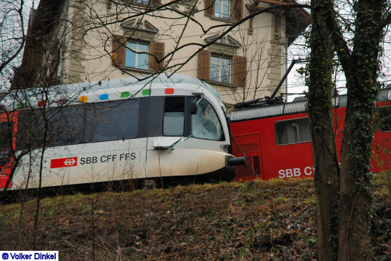 Re 4/4 II 420 230 (eine der für die HVZ-Lion-Züge umgebauten Lokomotiven) stiess zwischen Schaffhausen und Neuhausen mit Thurbo-GTW 526 750 zusammen (10.01.2013).