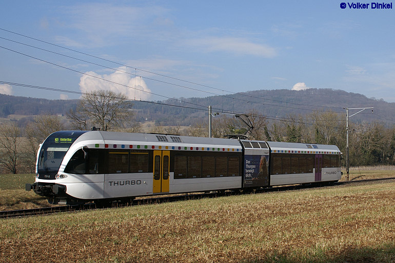 | Neu mit einer Werbebotschaft versehen wurde GTW 2/6 526 731. "Der Thurgau bewegt dich" ist Titelthema einer Kampagne, aufgenommen wurde das Fahrzeug als S41 Waldshut - Winterthur von Volker Dinkel (Mellikon, 21.02.2006). Nachtrag: Werbung wurde am 03.11.07 entfernt. |