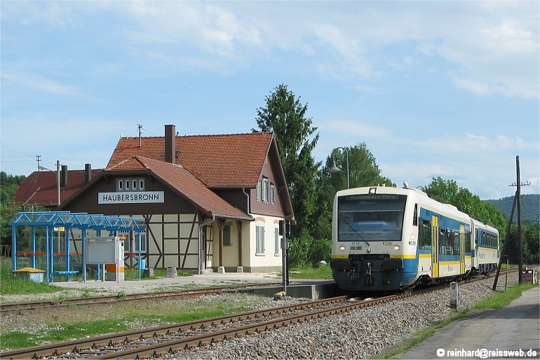 Die WEG-Fahrzeuge VT 441 (Regioshuttle) und VT 421 (NE81) sind gemeinsam im Einsatz auf der Wieslauftalbahn Schorndorf - Rudersberg Nord (23.05.2003).
