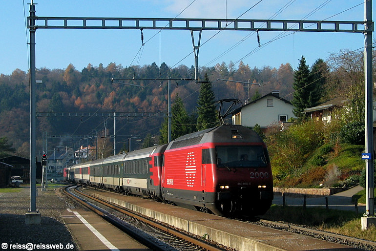 | Im "Sandwich" gefahren wurde IR 2566 Zürich - Schaffhausen am 19.11.2005, Kommunikationsprobleme zwischen Lok und Steuerwagen erforderten eine Lok an der Spitze. 460 075 u. 460 040 teilten sich in diesem Fall die Aufgabe, aufgenommen wurden sie in Lottstetten. |