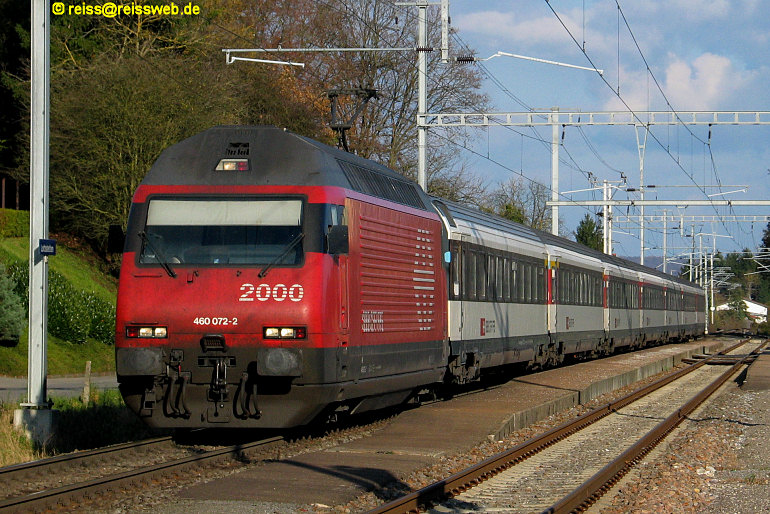 Immer noch ein Foto wert sind die EW-IV-Garnituren in komplett neuer Lackierung, im Regelfall sind gemischte Garnituren unterwegs. 460 072 bringt IR 2577 von Schaffhausen nach Zürich (Lottstetten, 19.11.2005).