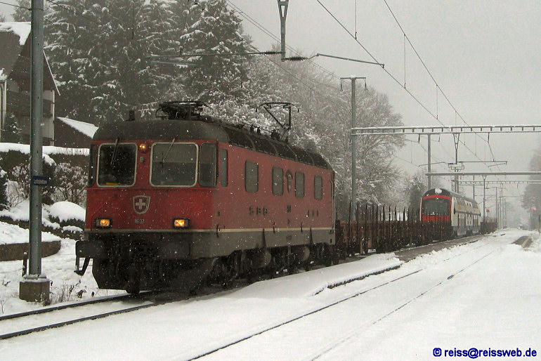 Eine besondere Fracht hatte Re 6/6 11637 am Haken - mit RABe 514 003-3 wurden die 2 Endwagen des neuen Züricher S-Bahnzuges ("DTZ") nach Rorschach befördert, um dort mit den Mittelwagen einen kompletten Zug zu bilden (Lottstetten, 29.11.2005).