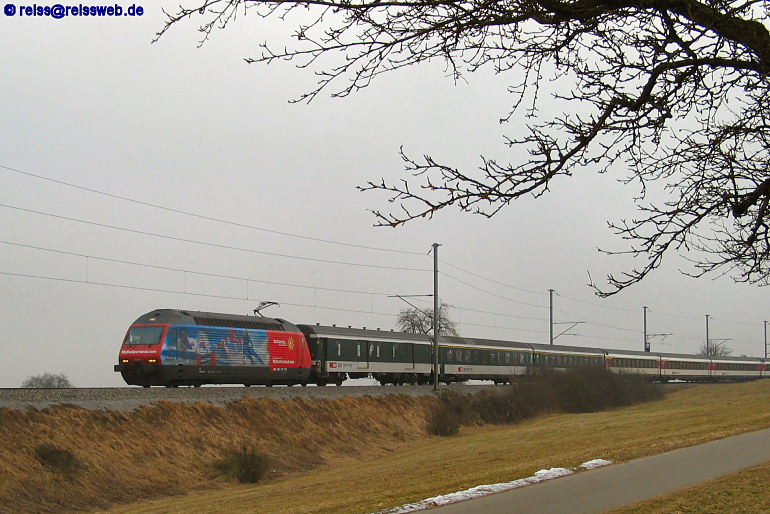 | Passend zu den Schulferien gibt es an 3 Wochenenden direkte Züge von Schaffhausen nach Brig. Weil der Züricher HB nicht angefahren wird, verkehren die Züge mit der Lok Seite Schaffhausen, für den Lottstetter Fotostandpunkt ein ungewohnter Anblick (04.02.2006). |