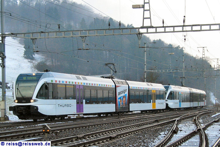 Erste Begegnung mit einer GTW 2/6-2/8-Doppeltraktion - 526 728 u. 526 753 fahren am 09.02.2006 als Regionalzug 8137 Waldshut - Winterthur in Eglisau ein. Auf diesem Bild sind übrigens alle 5 GTW-Türfarben vertreten!