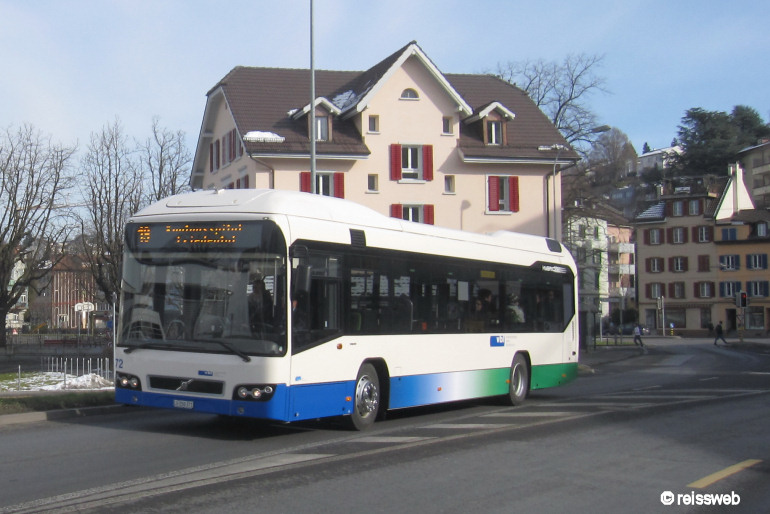 Am 04.02.2011 wurden die ersten beiden Hybridbusse der VBL vom Typ Volvo 7700 Hybrid der Presse vorgestellt. Ab Mittag war Wagen 72 bereits auf der Linie 19 im Einsatz, aufgenommen beim Verlassen der Haltestelle Schlossberg (Luzern, 04.02.2011).