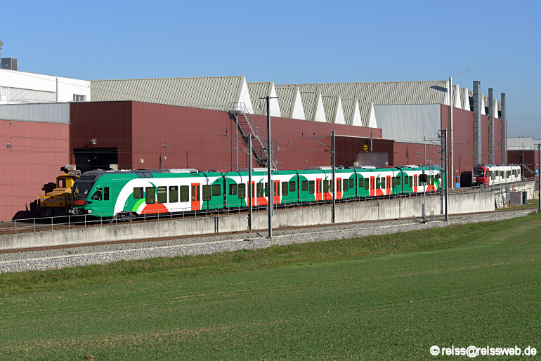 Auf dem Inbetriebsetzungsgleis in Bussnang stehen ein Flirt für die Ferrovie Emilia Romagna (Italien) und ein Meterspur-GTW für die TPF (10.11.2015).