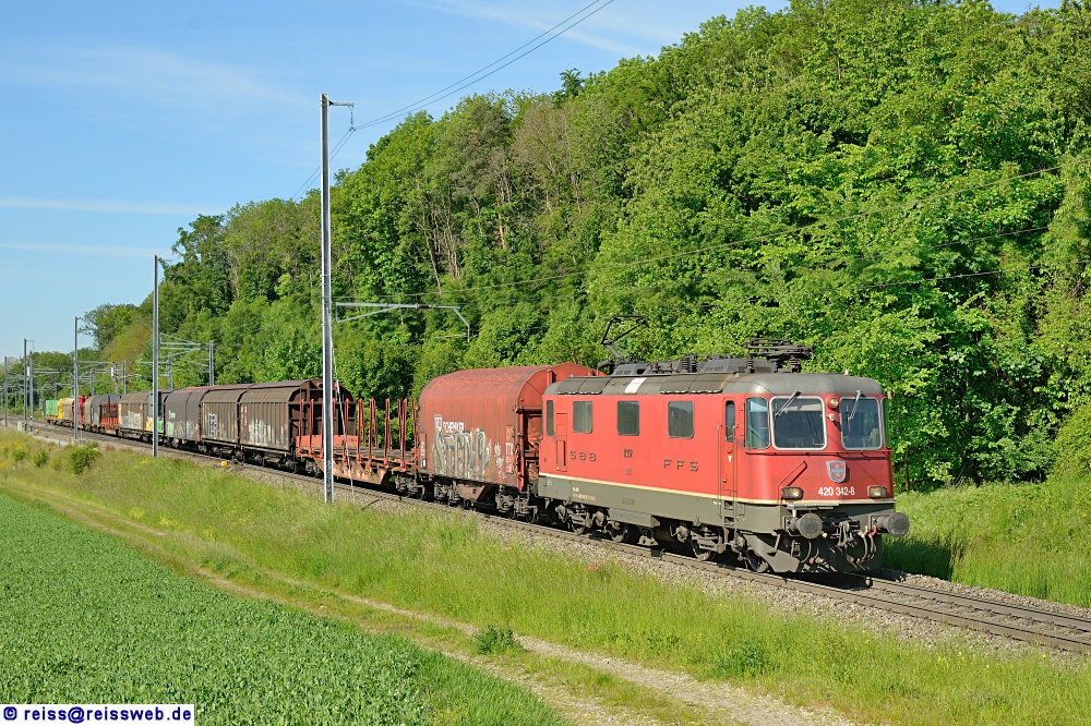SBB Cargo 420 342 bringt den Güterzug 44612 vom Rangierbahnhof Limmattal nach Singen (Neuhausen, 28.05.2021).