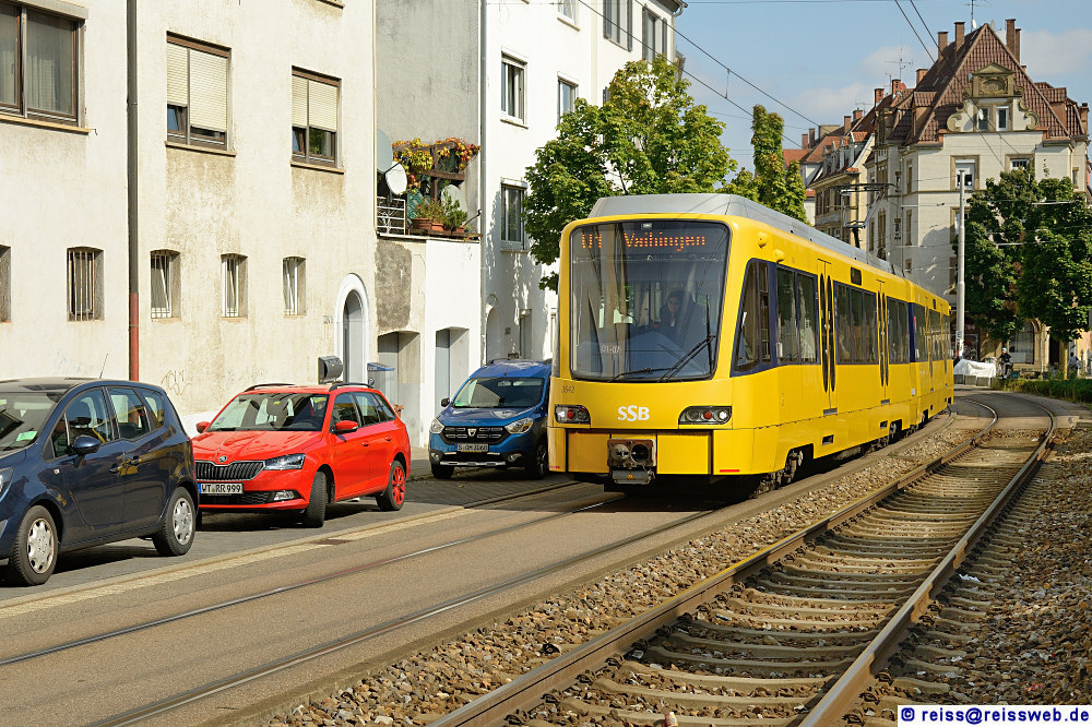 DT 8.14 3541/3542 (Hersteller Stadler-Pankow, Bj. 2017) der SSB ist auf der Linie 1 unterwegs nach Vaihingen, aufgenommen in der Böblinger Str. zwischen den Haltestellen Bihlplatz und Südheimer Platz (21.09.2021).