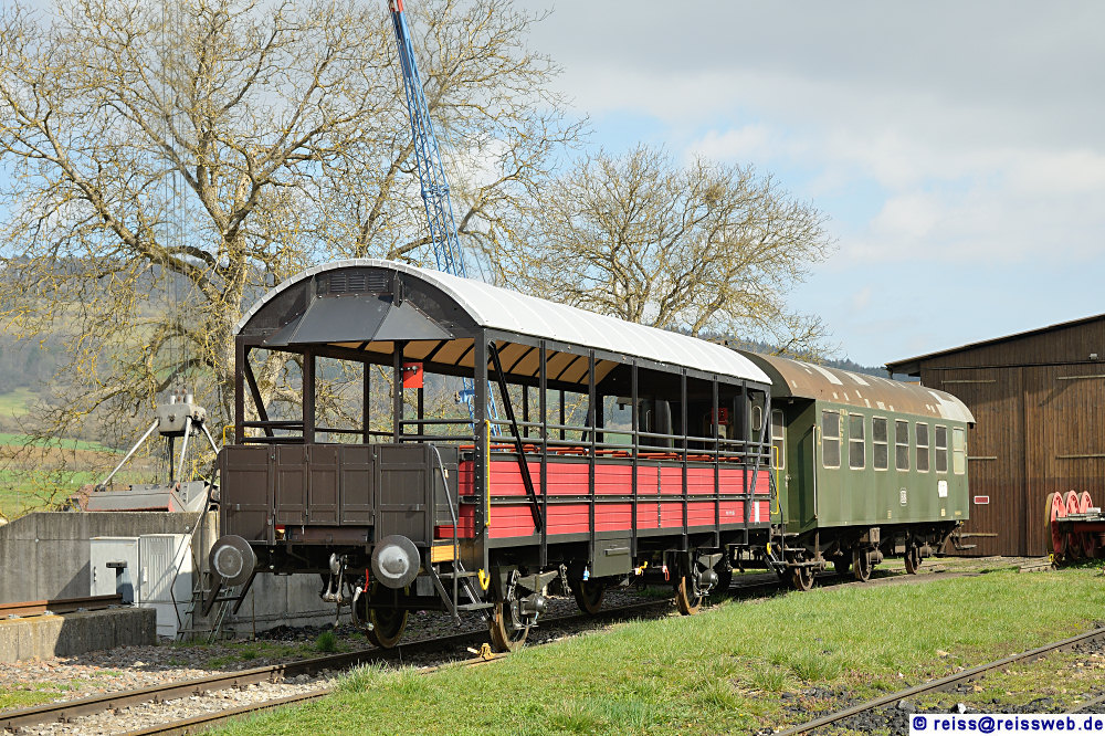 | In Fützen steht ein Sommerwagen der Sauschwänzlebahn, ein zweiter Wagen befindet sich wahrscheinlich im Lokschuppen. An beiden Wagen müssen noch Restarbeiten vorgenommen werden, damit sie im Laufe der Saison 2023 eingesetzt werden können (04.04.2022). |
