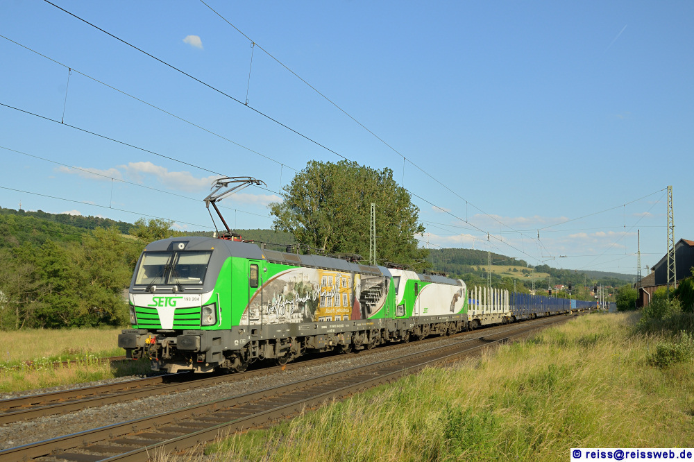 SETG 193 294 "Mozart" bringt ihre Schwesterlok 193 240 und eine leere Holzzuggarnitur durch Unterhaun nach Norden (16.06.2022).