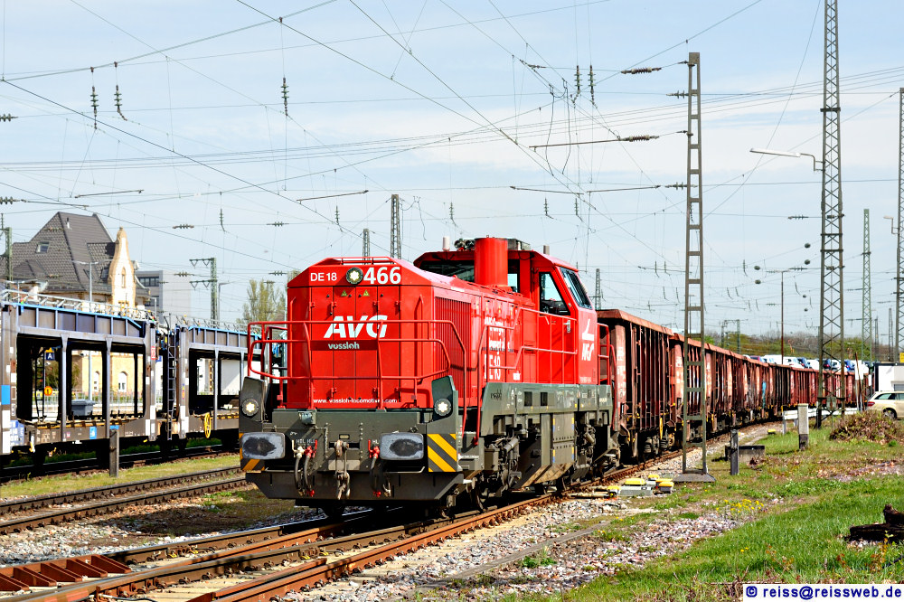 DE 18 4185 027-4 (AVG 466) stellt in Rastatt die zweite Hälfte der für Recycling-Lang bestimmten Leerwagen in ein Nebengleis und wird im Anschluss einen mit Schrott beladenen Zug nach Karlsruhe mitnehmen (05.04.2024).