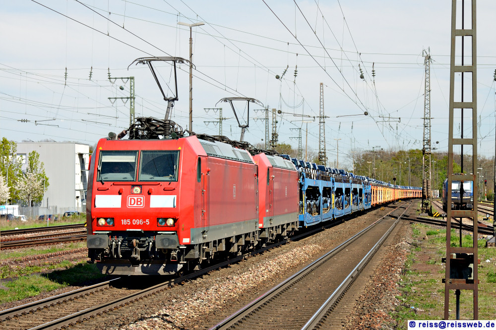 185 096 und eine weitere unerkannt gebliebene 185 bringen einen Zug mit werksneuen PKW durch Rastatt nach Süden (06.04.2024).