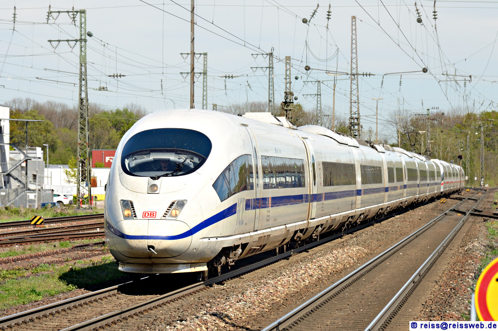 | DB 406 501 /001 "Europa" mit Zierstreifen in der passenden Farbe passiert Rastatt auf dem Weg nach Basel Bad Bf. Die blauen Zierstreifen trägt er seit Mai 2019. Der hintere Triebzug ist wie der führende 406 001 für Niederlande und Belgien zugelassen und trägt die Garniturnummer 4653 (06.04.2024). |