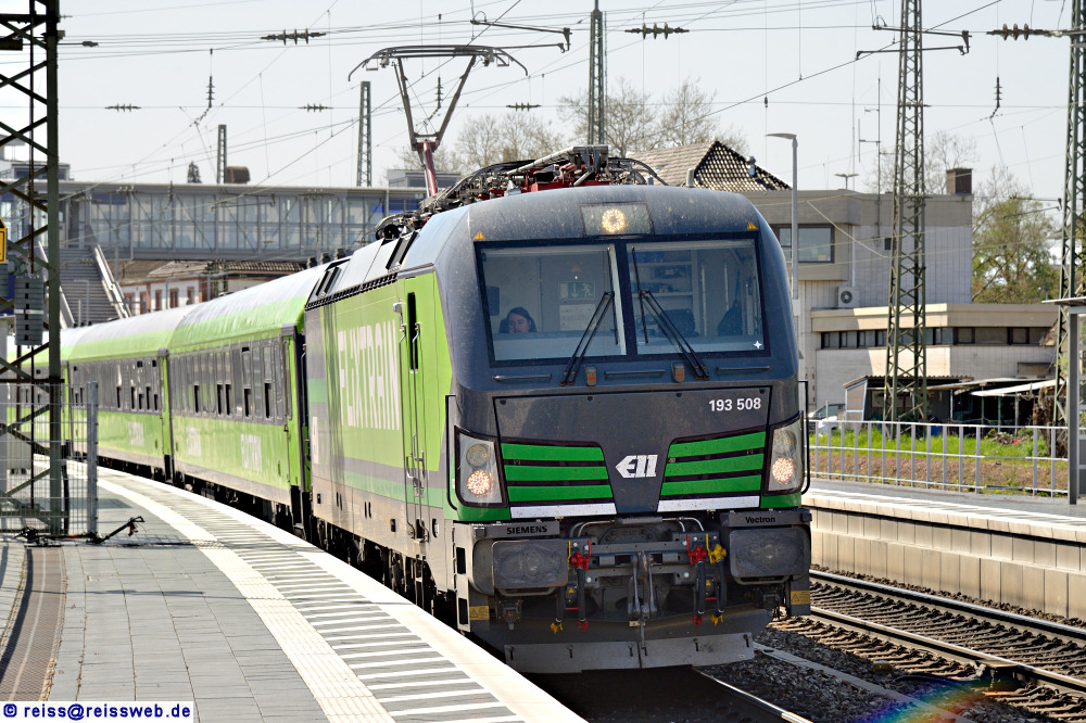 ELL 193 508 mit ELL-Grundfarben, jedoch an der Seite mit Flix-Train-Beschriftung, führt den Flixtrain aus Basel zum Ziel in Berlin (Rastatt, 06.04.2024).