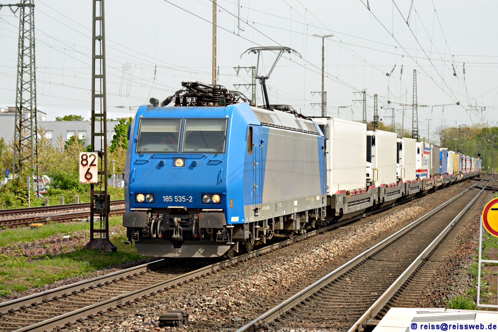 BLSC 185 535 bringt einen KV-Zug "Cargobeamer" durch Rastatt nach Süden (13.04.2024).