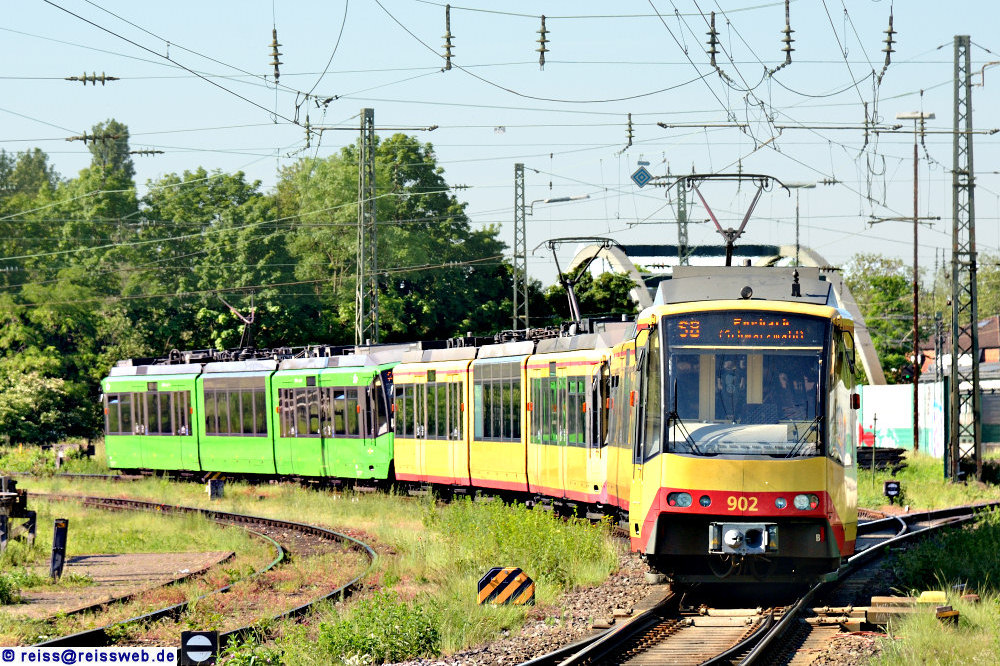 Eine Dreier-Kombination von AVG GT8-100D/2S-M fährt ins Murgtal mit dem grünen AVG 915 an der Spitze. Die letzte Einheit wird in Forbach abgehängt, die beiden vorderen Einheiten fahren nach Freudenstadt bzw. nach Bondorf (Rastatt, 14.05.2024).