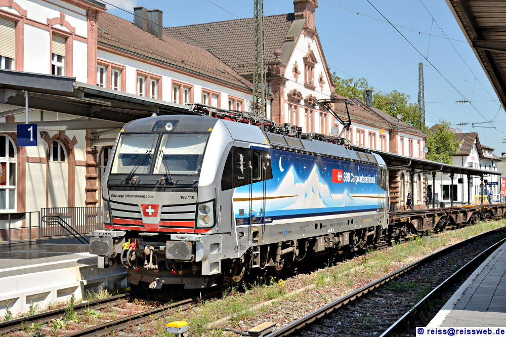 | Railpool 193 110 (vermietet an SBB Cargo und auch die 300ste Vectron-Lok für Railpool) wartet in Rastatt auf die Weiterfahrt nach Basel. Zum Zeitpunkt der Aufnahme hatten eine Reihe Vectron-Loks noch keine Zulassung in der Schweiz und in Italien (14.05.2024). |