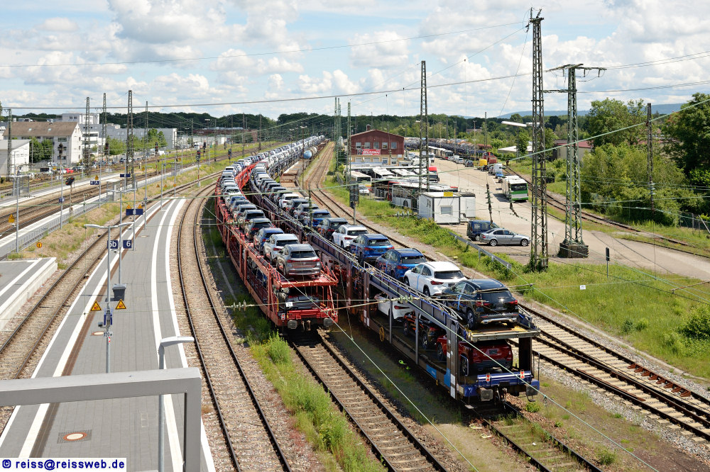 In Rastatt stehen zwei Daimler-Benz-Neuwagenzüge aus dem Werk Wintersdorf (Rastatter Stadtteil). Anzunehmen ist, daß zwei EVU für die Weiterbeförderung beauftragt wurden, dafür sprechen die unterschiedlichen Wagengarnituren (25.05.2024).