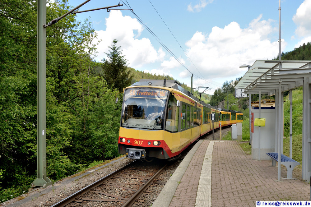 | Am Bedarfshaltepunkt Kirschbaumwasen (gelegen zwischen den Bahnhöfen Raumünzach und Schönmünzach) haben AVG 907 und ein weiterer Triebwagen so gehalten, daß ich an einer der beiden vorderen Türen aussteigen konnte. Grund: Der Bahnsteig ist nur 20 m lang! (28.05.2024). |