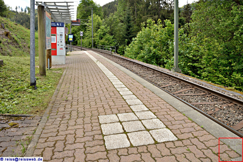 | Gesamtansicht des 20-m-Bahnsteigs in Kirschbaumwasen. Er wird praktisch nur als Startpunkt oder Ziel von Wanderen benutzt. Die AVG-Triebwagen vom Typ GT8-100D/2S-M können bei der Türöffnung speziell nur die beiden vorderen Türen freigeben, ansonsten wäre ein Halt nicht gestattet (28.05.2024). |