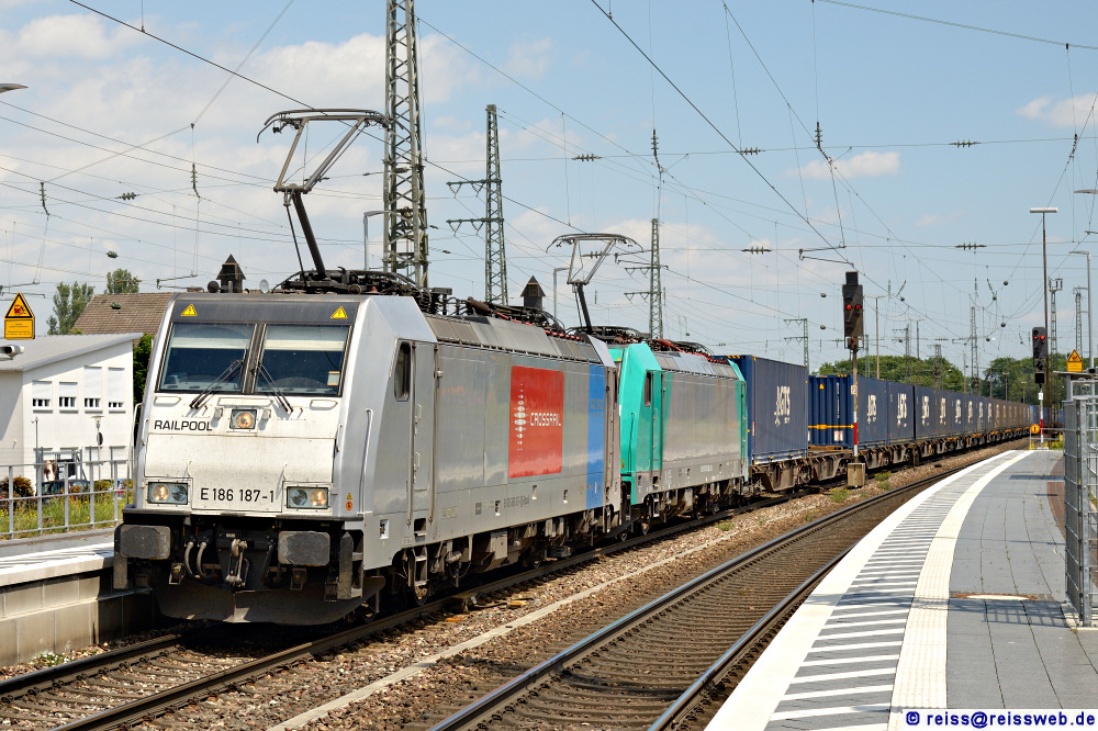 Crossrail 186 187 (Railpool) und eine ATLU-Lok (ebenfalls von Crossrail gemietet) führen einen Zug mit GTS-Containern durch Rastatt nach Süden (10.06.2024).