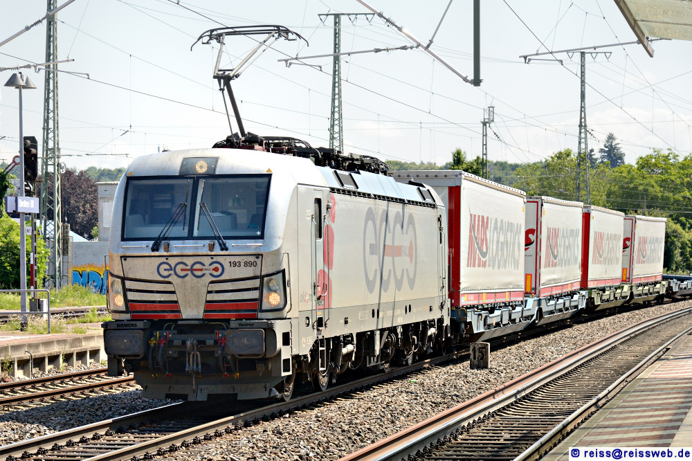 Ecco-Rail 193 890 (angemietet von Akiem) führt den als MARS-Zug bekannten KV-Zug Triest - Bettembourg durch Bretten (12.06.2024).