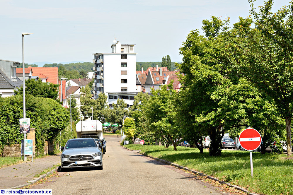| Blick von der bis zum 29.12.2024 genutzten Talstation der Turmbergbahn (direkt im Rücken des Fotografen) hinunter zur Grötzinger Straße (B 3), wohin die "neue" Turmbergbahn verlängert werden soll. Verlauf im grünen "Mittelstreifen" rechts. Im Hochhaus habe ich während meines Studiums in Karlsruhe gewohnt (18.06.2024).