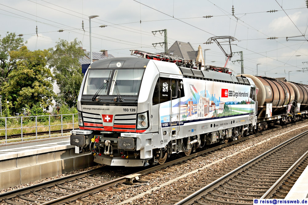 SBB Cargo 193 139 im Design "Italienpiercer", die erst vor zwei Wochen beklebt wurde. Sie führt einen Kesselwagenzug durch Rastatt nach Süden (28.06.2024).