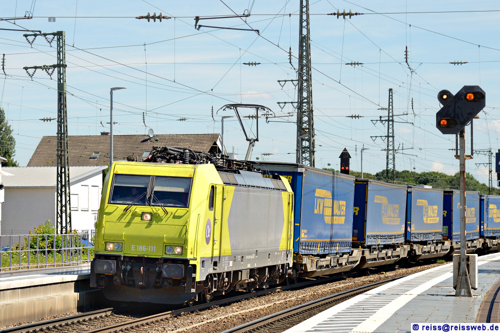 Crossrail 186 111 (91 84 1186 111-8 NL-ATLU) bringt einen Walter-KV-Zug durch Rastatt nach Süden (08.07.2024).