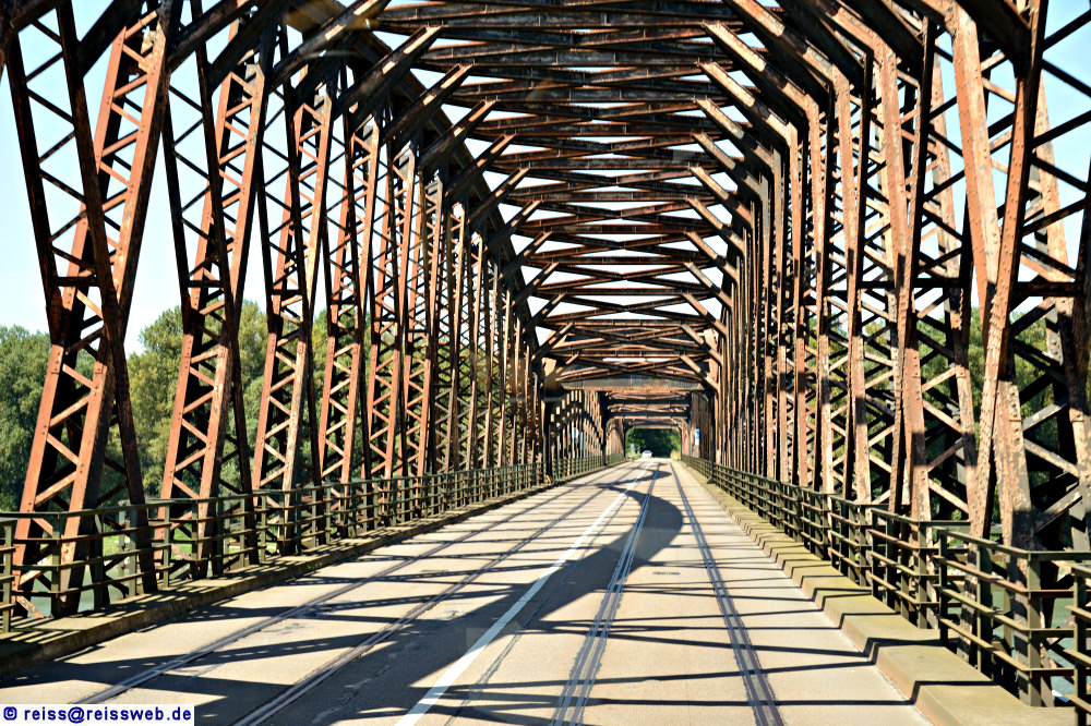 | Beim Übergang von der Vorflutbrücke zur ursprünglichen Brücke müssen Fußgänger am Rand der Fahrbahn laufen, Radfahrer sollten das Befahren der Rillengleise (auch wenn sie mit Gummistreifen ausgelegt wurden) möglichst vermeiden (Aufnahme aus einem Bus der Linie 231 Rastatt - Soufflenheim, im D-Ticket enthalten) [11.08.2024]. |