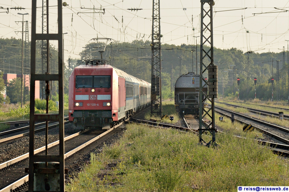 | DB 101 120 bringt einen stark verspäteten Nachtzug (NJ) nach Basel SBB (von dort mit SBB-Lokomotive weiter) und muß einem Sonderzug mit 103 113 Platz machen. Er fährt deshalb auf Gleis 4 in Rastatt (eigentlich Richtungsgleis Nord) mit verringerter Geschwindigkeit ein (31.08.2024). |