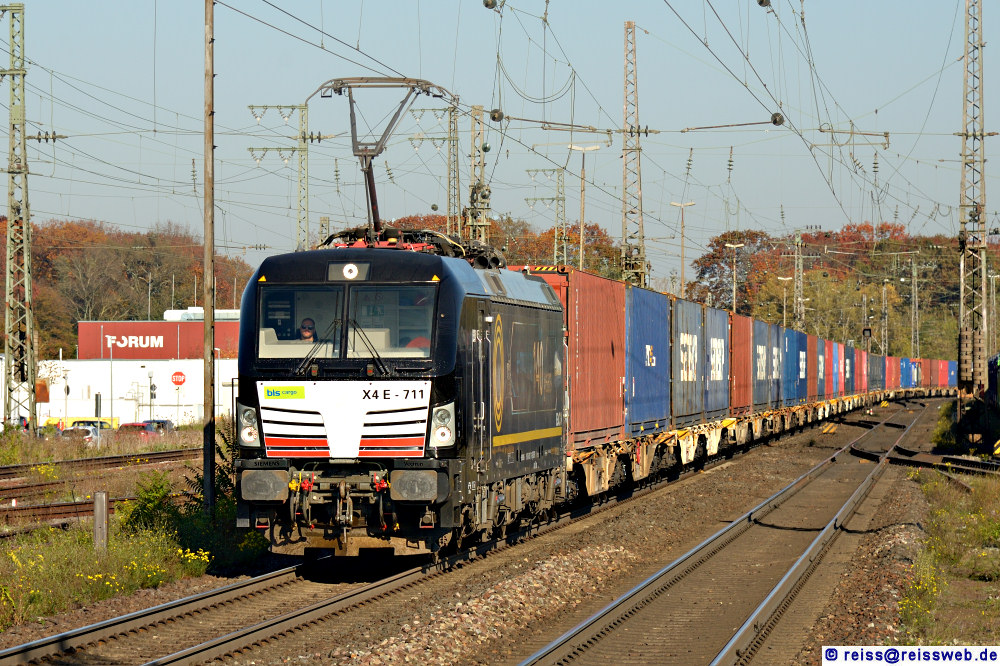 Beacon 193 711 (an BLS Cargo vermietet) bringt einen Container-Zug durch Rastatt nach Süden (29.10.2024).