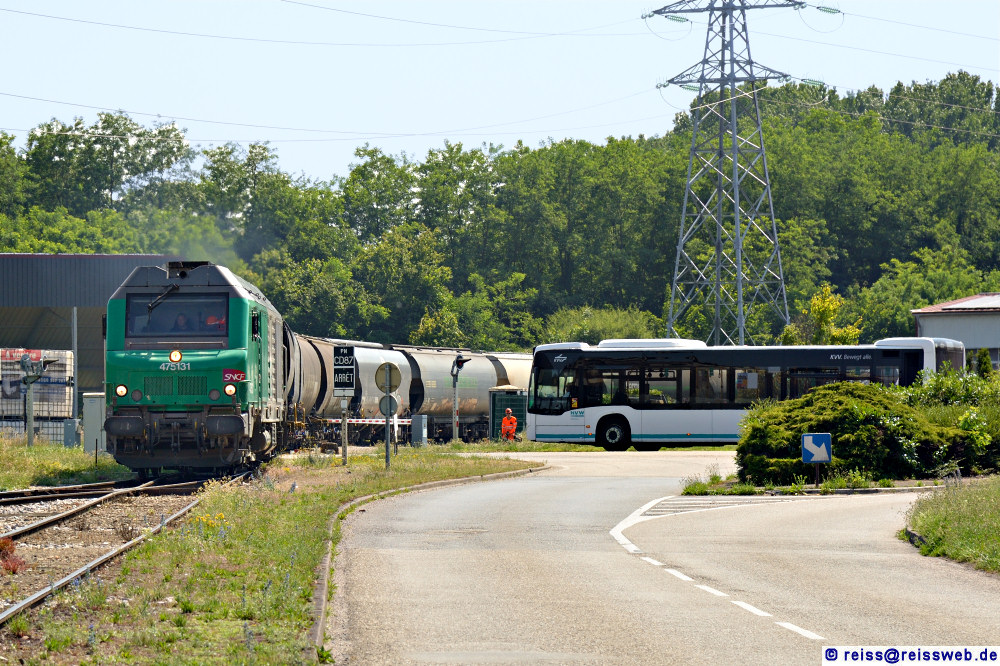 | fSNCF BB 75131 fährt nach kurzem Warten (da noch eine Gleissperre geöffnet werden mußte) über den BÜ zum Roquette-Werk Beinheim. Daß ausgerechnet ein NVW-Bus am BÜ warten mußte, war für mich schon skurril - ich hatte bei ca. 15 Busfahrten auf der Linie 231 niemals einen geschlossenen BÜ angetroffen (19.06.2025). |