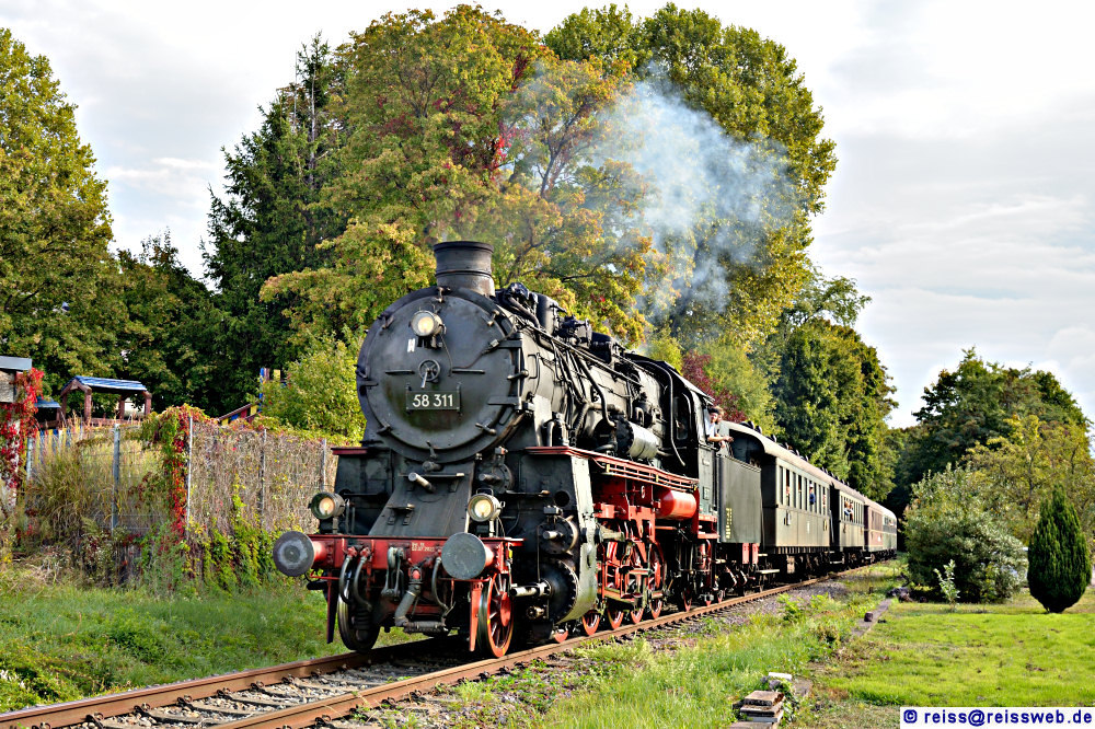 | UEF 58 311 ist unter dem Motto "Rund um Karlsruhe" am 21.09.2025 in drei Richtungen unterwegs: Am Vormittag auf der Wintersdorfer Strecke (hier im Bild), über die Mittagszeit nach Reichenbach und am Nachmittag nach Winden in der Pfalz. Nach Wintersdorf und Winden wird nur einmal im Jahr gefahren (Aufnahme in Rastatt). |