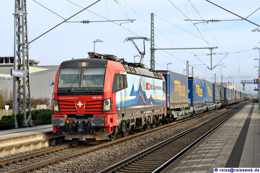 SBB Cargo 193 475 bringt einen KV-Zug durch Muggensturm Richtung Süden (18.12.2025).
