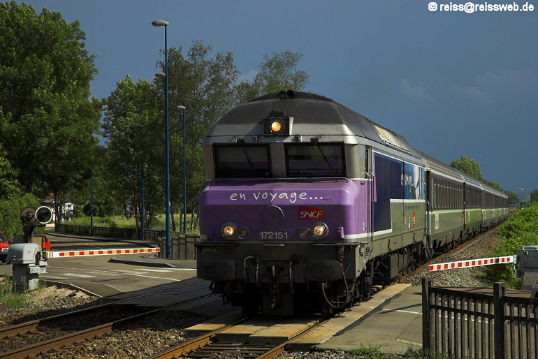 CC 72151 hat vor wenigen Minuten Belfort verlassen und lässt eine Wolkenwand hinter sich - Glück für den Fotografen, daß Lok und Zug noch von der Sonne erfasst wurden (Valdoie, 24.05.2007).