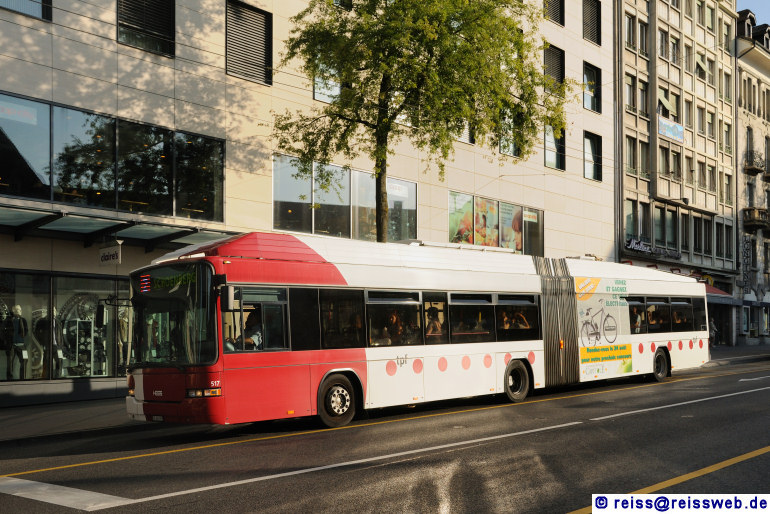 Swisstrolley 517 von TPF (Transports Public Fribourgeois) an der Haltestelle "Gare CFF" in Fribourg (14.08.2009).
